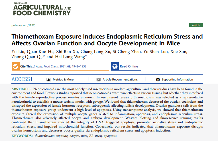 英国威廉集团官网齐忠权教授课题组在Journal of Agricultural and Food Chemistry(中科院1区)发表文章,揭示新烟碱类杀虫剂对雌性哺乳类动物的生殖毒性机制。