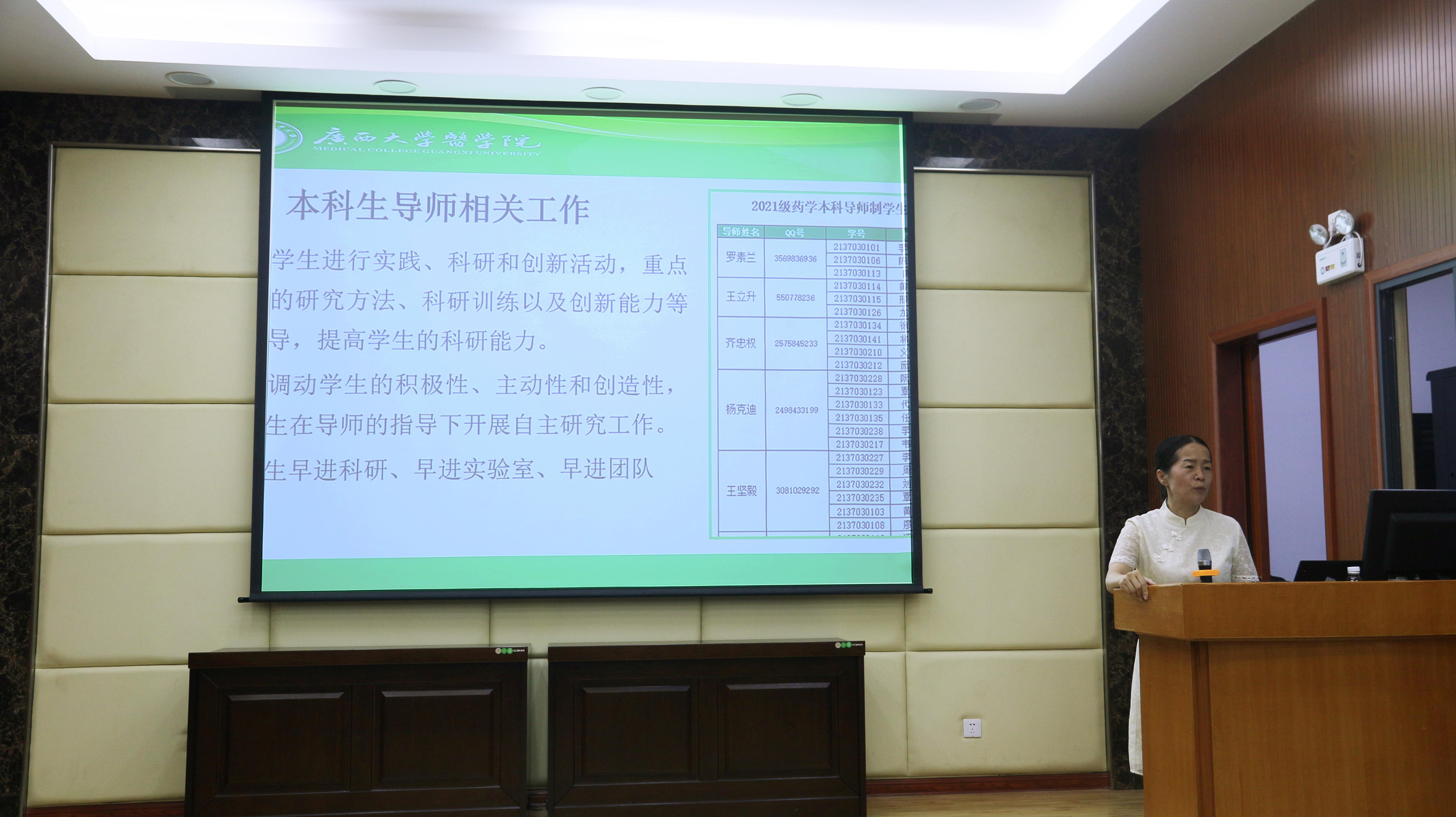 系主任杨华老师对药学本科专业的培养计划进行解读,指导2021级员工结合个人发展规划进行合理选课,对药学专业开设课程的门类、课程的内容以及课程设置与就业升学之间的关系进行了深入浅出的讲解,鼓励同学们充分利用第三学期的时间提高个人综合素质。