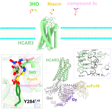 G蛋白偶联受体(G protein coupled receptors,GPCRs)是人类基因组中数量最多的膜蛋白受体超家族,长期是药物研发中重要且热门的靶点。羟基羧酸受体(hydroxycarboxylic acid receptors,HCAR)家族属于A类的GPCR,包括HCAR1、HCAR2、HCAR3三个成员,是人体内重要的代谢传感器。HCAR3主要在单核细胞、中性粒细胞、脂肪细胞和肠上皮细胞中表达,能够抑制脂肪分解,维持能量代谢平衡。HCAR3在免疫反应和代谢性疾病发挥重要作用,也是治疗结肠癌和乳腺癌的潜在药物靶点。