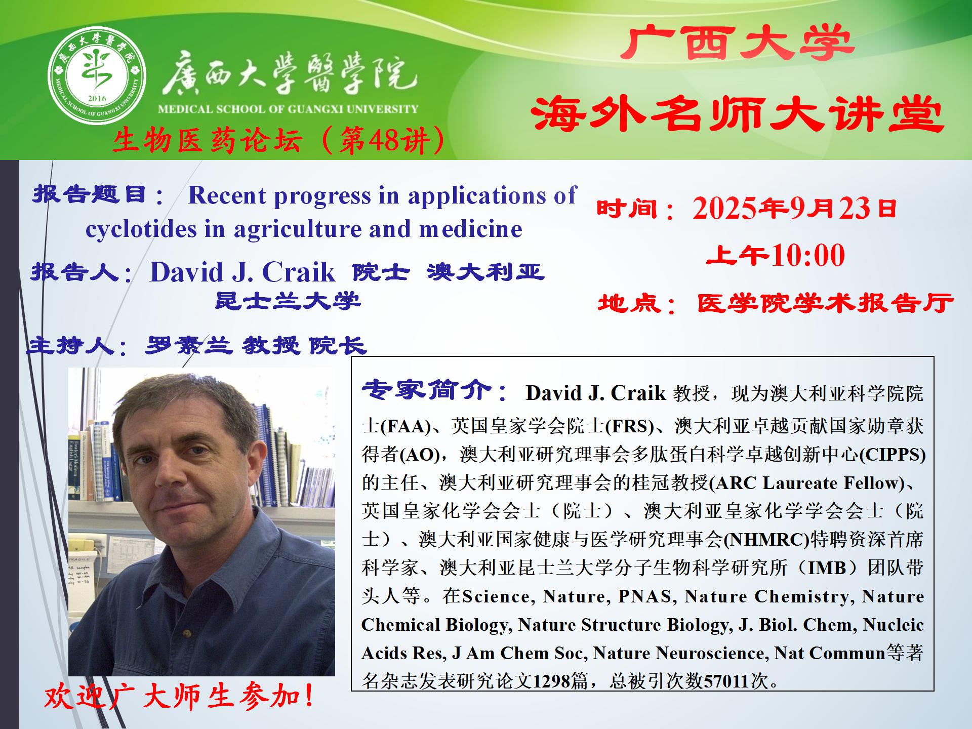 英国威廉集团官网生物医药论坛(第48讲):Recent progress in applications of cyclotides in agriculture and medicine