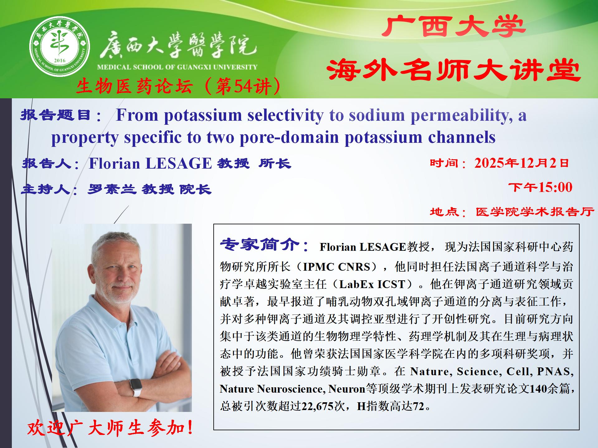英国威廉集团官网生物医药论坛(第54讲):From potassium selectivity to sodium permeability, a property specific to two pore-domain potassium channels